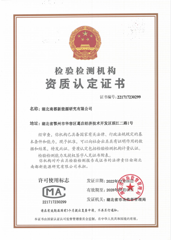 Our Hubei Research Institute has gained unanimously agreement by the evaluation team to award us CMA certificate with our good operation, professional management, great personnel training and advanced equipment.